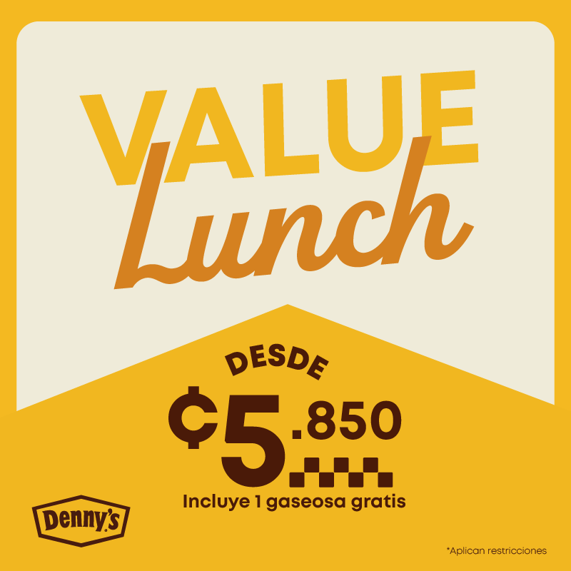 Value Lunch de lunes a viernes de 11:00 am a 3:00 pm. Con platos desde ₡5,8500, además incluye bebida gaseosa o té frío. Por 1,000 colones adicionales podés tener derecho a refill.